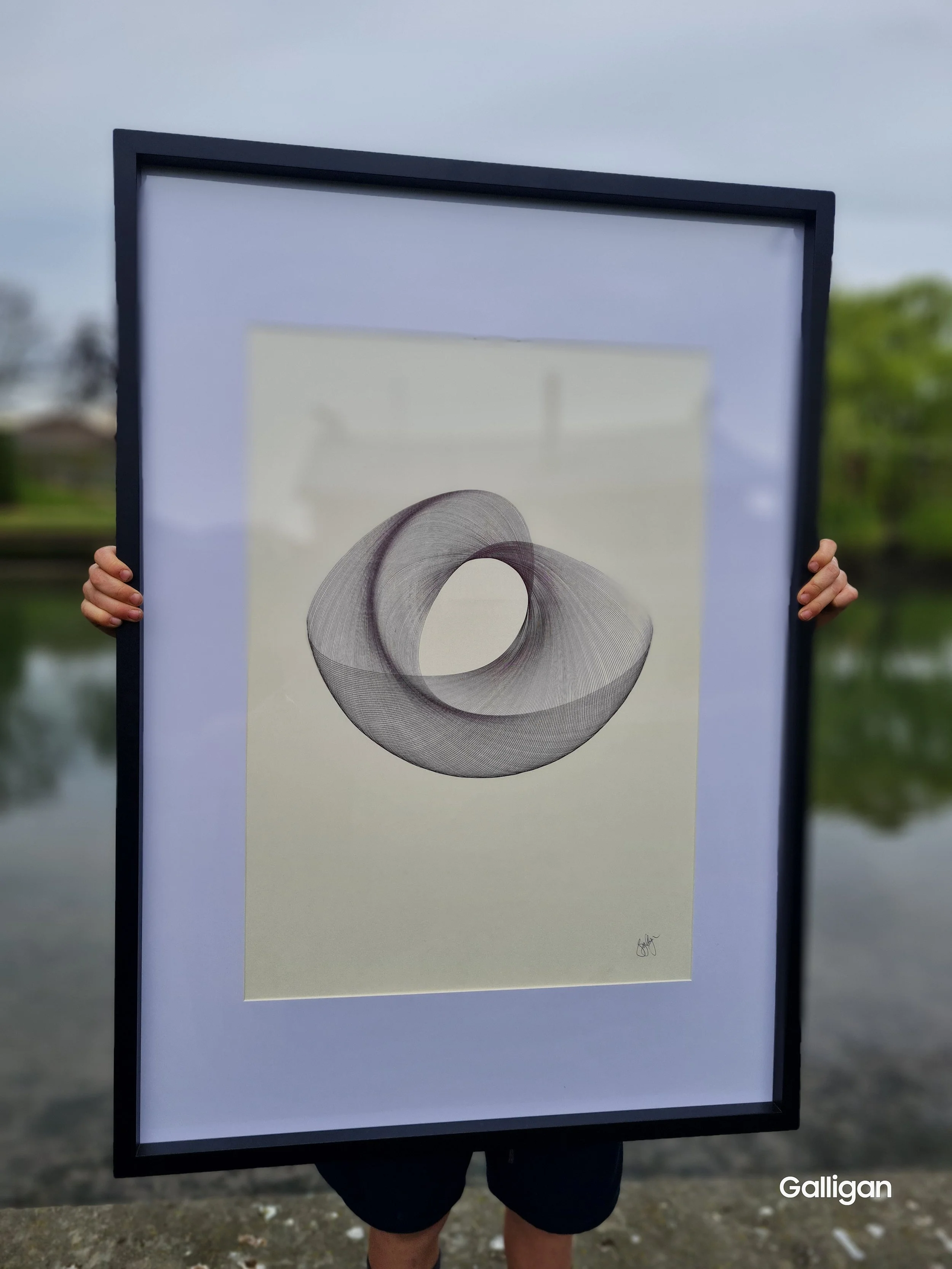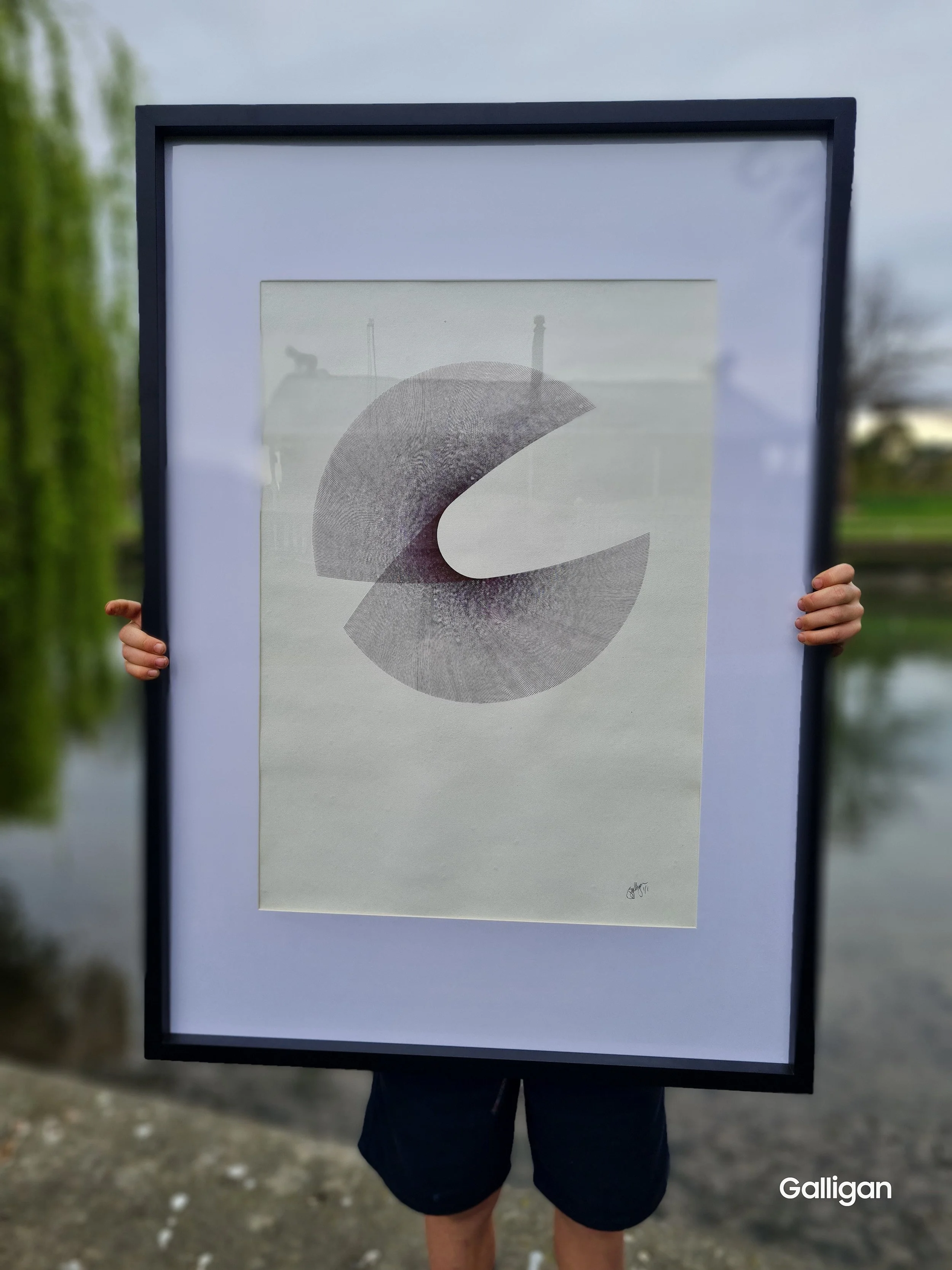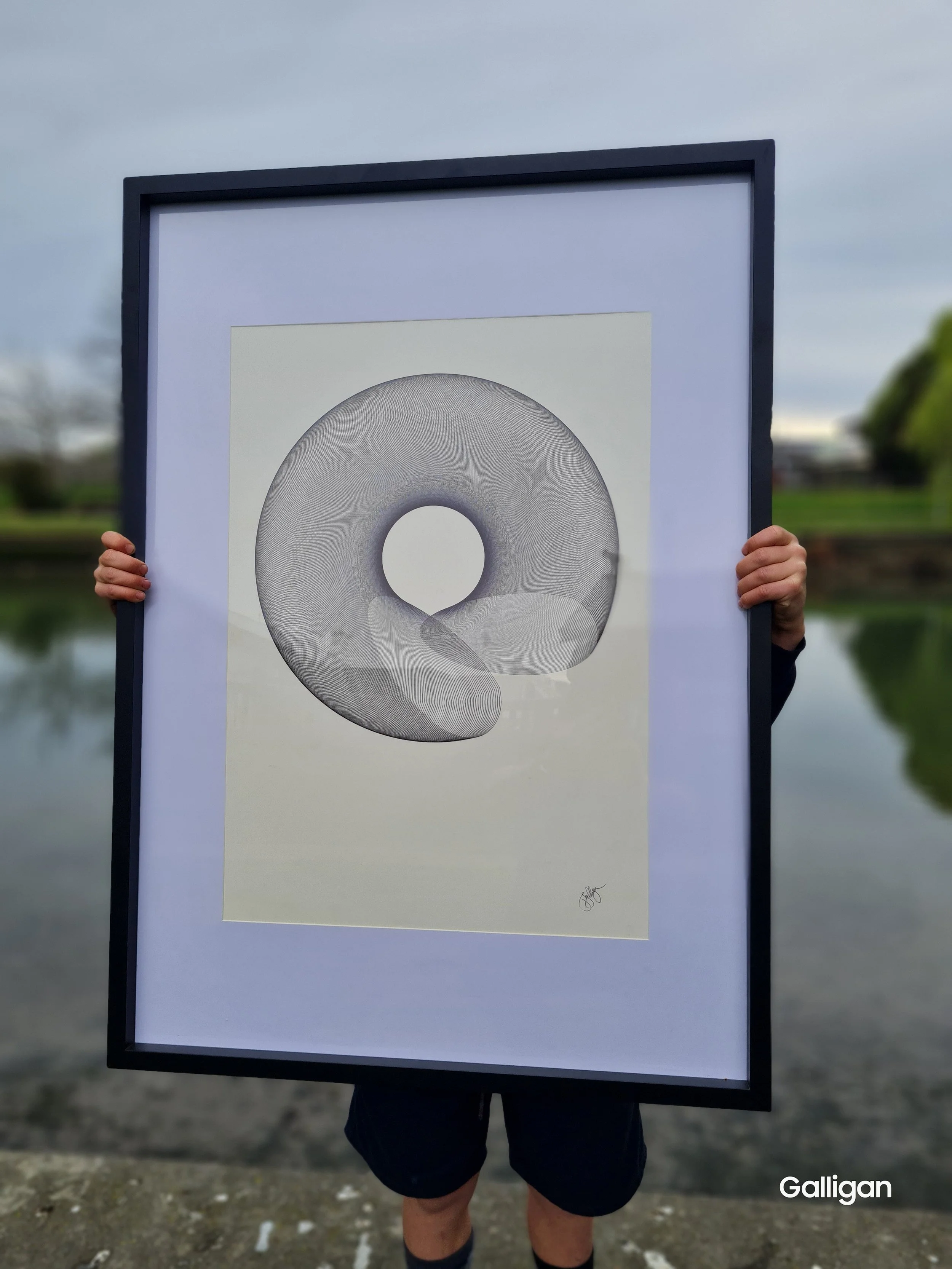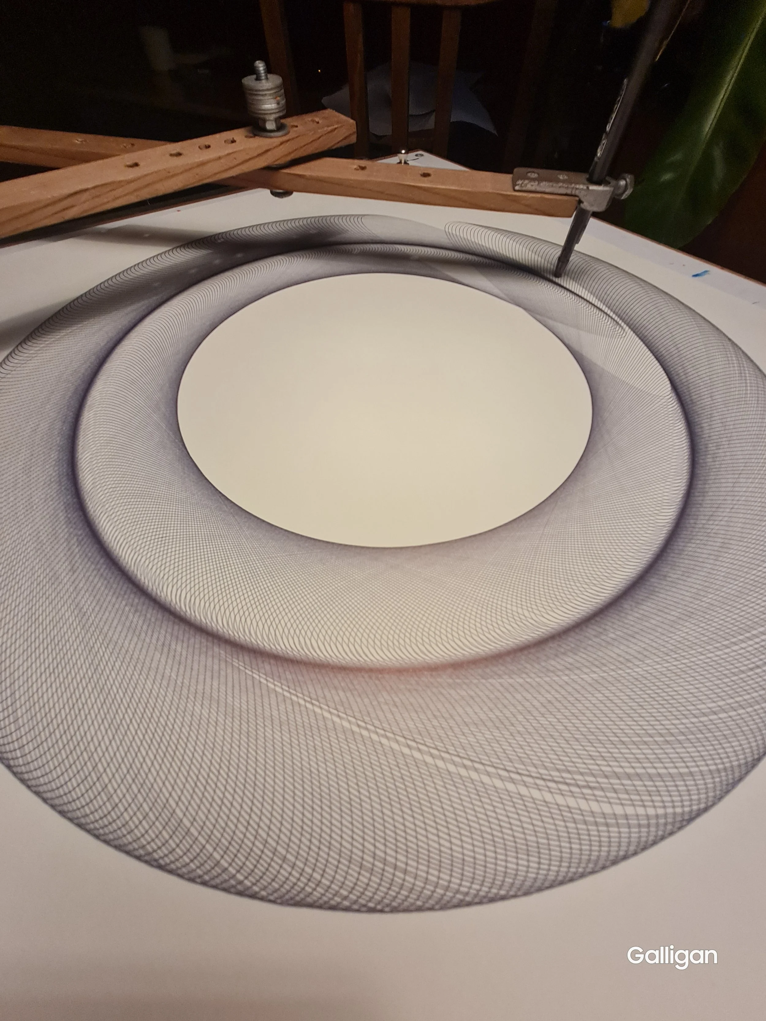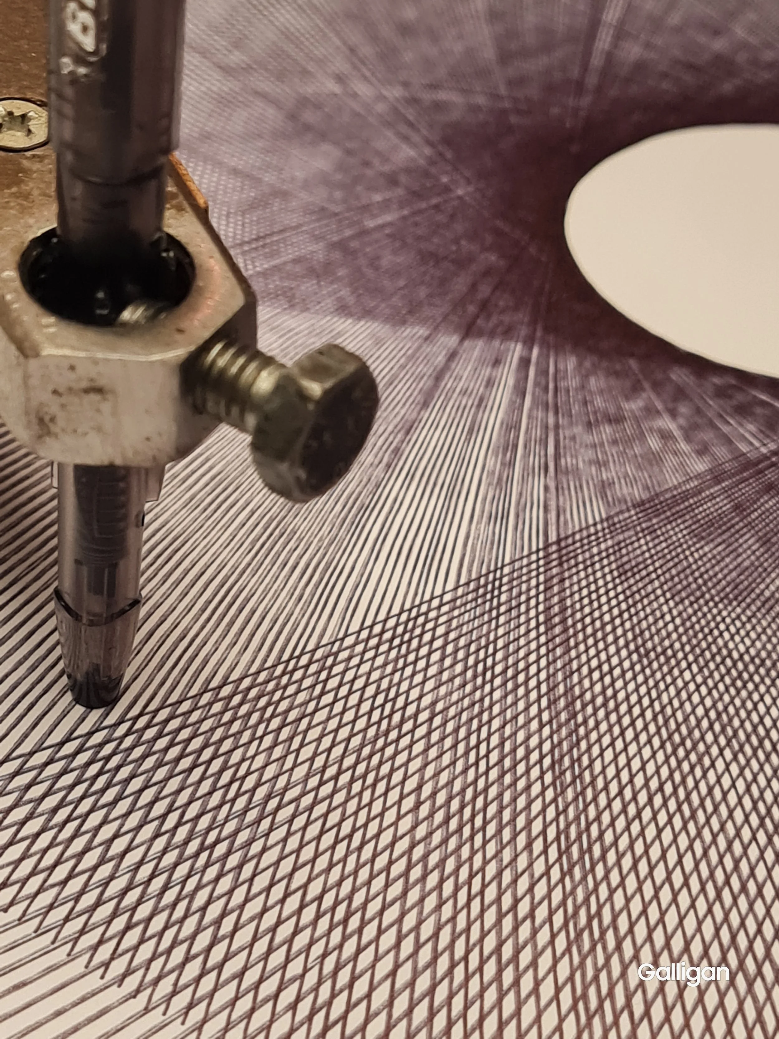 In 2021, Galligan hand built an analogue drawing machine that produces unique pen drawings. These images inspired Galligan’s sculpture